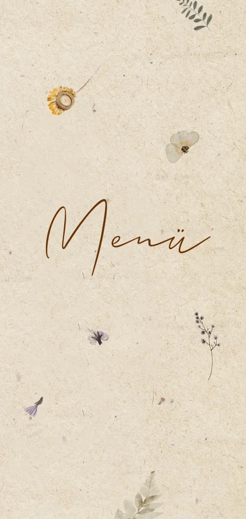 Menükarte Öko-Look mit TrockenblumenDas Design der von dir gewählten Karte wurde automatisch in andere Formate umgestellt. Wähle einfach deinen Wunschformat aus und platziere alle Texte und Elemente an der richtigen Stelle im Editor. Du hast Fragen oder dein Favorit steht nicht zur Auswahl? Dann kontaktiere uns bitte und wir werden uns gemeinsam darum kümmern!