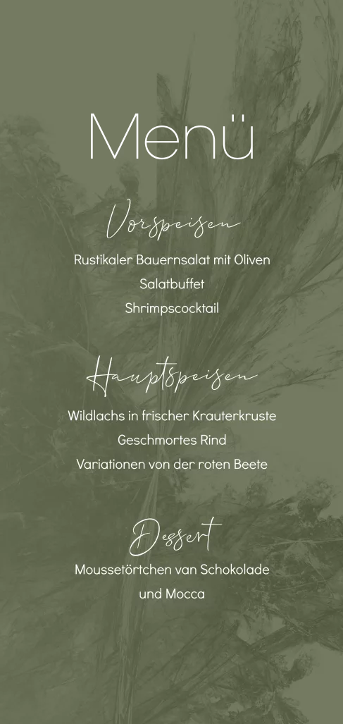 Menükarte Poem of the sea in Grün mit edlem FoliendruckDas Design der von dir gewählten Karte wurde automatisch in andere Formate umgestellt. Wähle einfach deinen Wunschformat aus und platziere alle Texte und Elemente an der richtigen Stelle im Editor. Du hast Fragen oder dein Favorit steht nicht zur Auswahl? Dann kontaktiere uns bitte und wir werden uns gemeinsam darum kümmern!