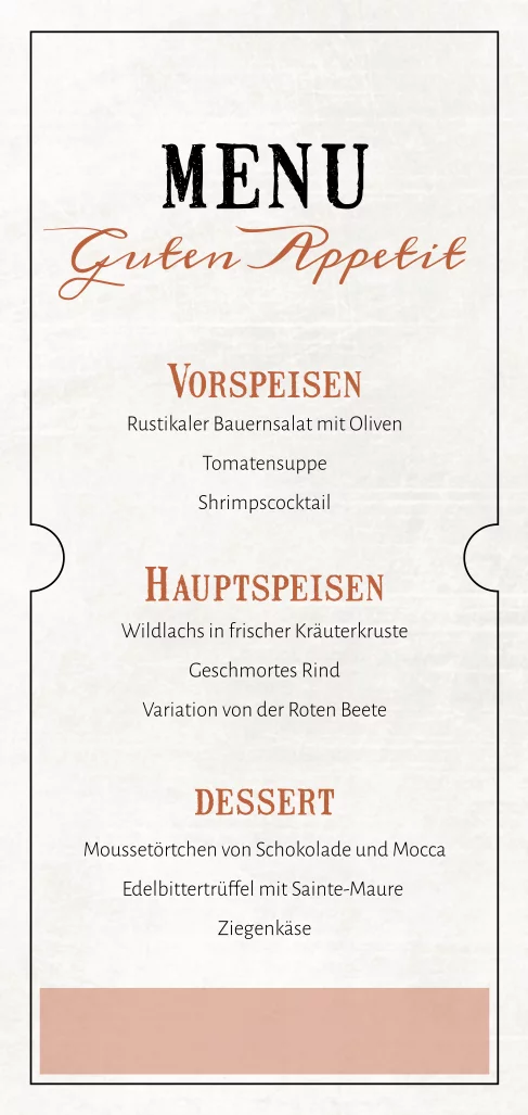 Menükarte im Ticketstil.Melde dich für unseren Newsletter an und profitiere von exklusiven Angeboten, kreativen Ideen und Neuigkeiten aus unserer Produktwelt. Als Dankeschön für deine Anmeldung schenken wir dir einen kostenlosen Probedruck deiner Karte.