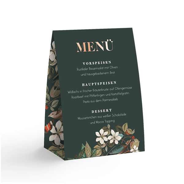Menükarte im Vintage / Boho Stil mit Roségoldfolie zum AufstellenMelde dich für unseren Newsletter an und profitiere von exklusiven Angeboten, kreativen Ideen und Neuigkeiten aus unserer Produktwelt. Als Dankeschön für deine Anmeldung schenken wir dir einen kostenlosen Probedruck deiner Karte.