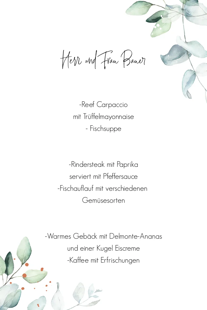 Das Menüheft bzw. die Menükarte auf dem feierlich gedeckten Tisch lässt Deine Gäste von Herzen zugreifen. Neben den Tischkarten sind die Menühefte der wichtigste Teil der Hochzeitspapeterie für die Feierlichkeiten nach der Trauung.Hast du schon die dazu passende Save the date Karte, Hochzeitskarte und Dankeskarte gesehen?