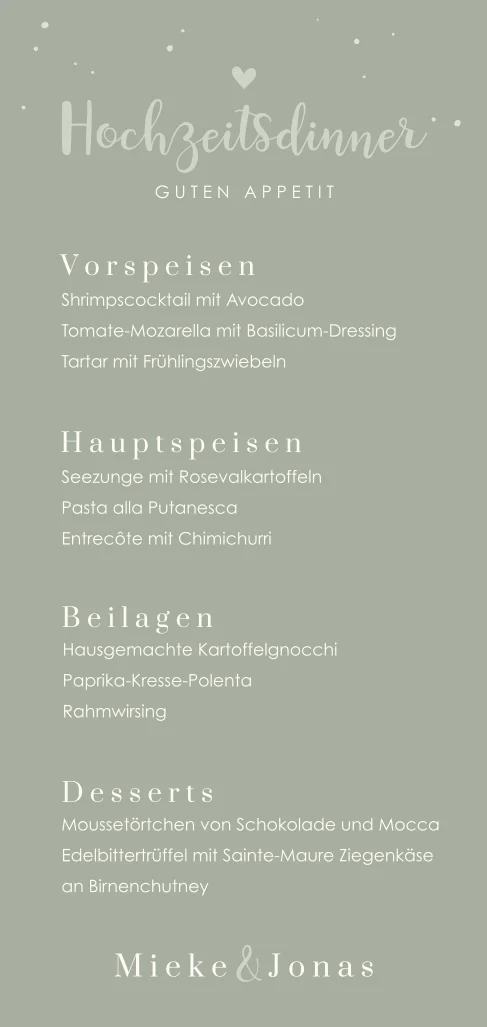 Menükarte in mintgrün mit Herzchen und Punkten