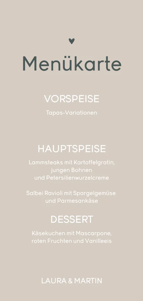 Moderne Menükarte mit beigem Hintergrund und dunkelgrüner SchriftMelde dich für unseren Newsletter an und profitiere von exklusiven Angeboten, kreativen Ideen und Neuigkeiten aus unserer Produktwelt. Als Dankeschön für deine Anmeldung schenken wir dir einen kostenlosen Probedruck deiner Karte.