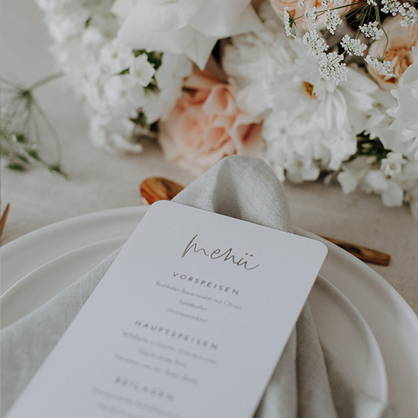 Die Menükarte auf dem feierlich gedeckten Tisch lässt eure Gäste von Herzen zugreifen. Neben den Tischkarten sind die Menühefte der wichtigste Teil der Hochzeitspapeterie für die Feierlichkeiten nach der Trauung.Dazu empfehlen wir stylische Kartenhalter aus echtem Holz, um die Karte in voller Pracht zu präsentieren. Hier gelangst du direkt zur Auswahl.