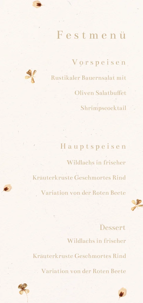 Retro-Menükarte mit gepressten Blüten - Einfaches länglich.Dazu empfehlen wir stylische Kartenhalter aus echtem Holz, um die Karte in voller Pracht zu präsentieren. Hier gelangst du direkt zur Auswahl.