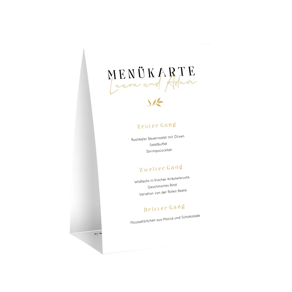 Romantischer Menükarten-Aufsteller zur Hochzeit mit Namen und Zweig