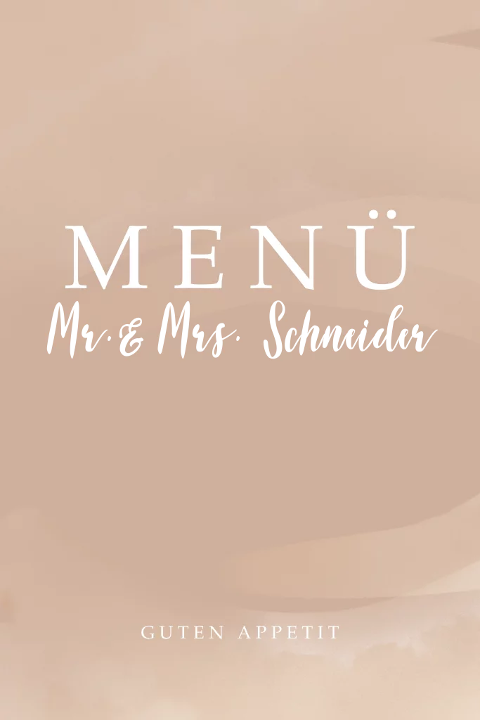 Haben eure Gäste ihren Platz im Saal, im Restaurant oder auf der bestuhlten Terrasse erst einmal gefunden, geht der erste Griff meist zum Heft mit dem Hochzeitsmenü. Wichtig also, um die Menükarte mit Sorgfalt auszuwählen. Diese stilvolle Hochzeitsmenükarte zeichnet sich durch klare und elegante Schriftarten und einen Aquarellhintergrund aus. In unserem Designmodul könnt ihr Text und Farben leicht anpassen.Hast du schon die dazu passende Save the Date Karte, Hochzeitskarte und Dankeskarte gesehen?