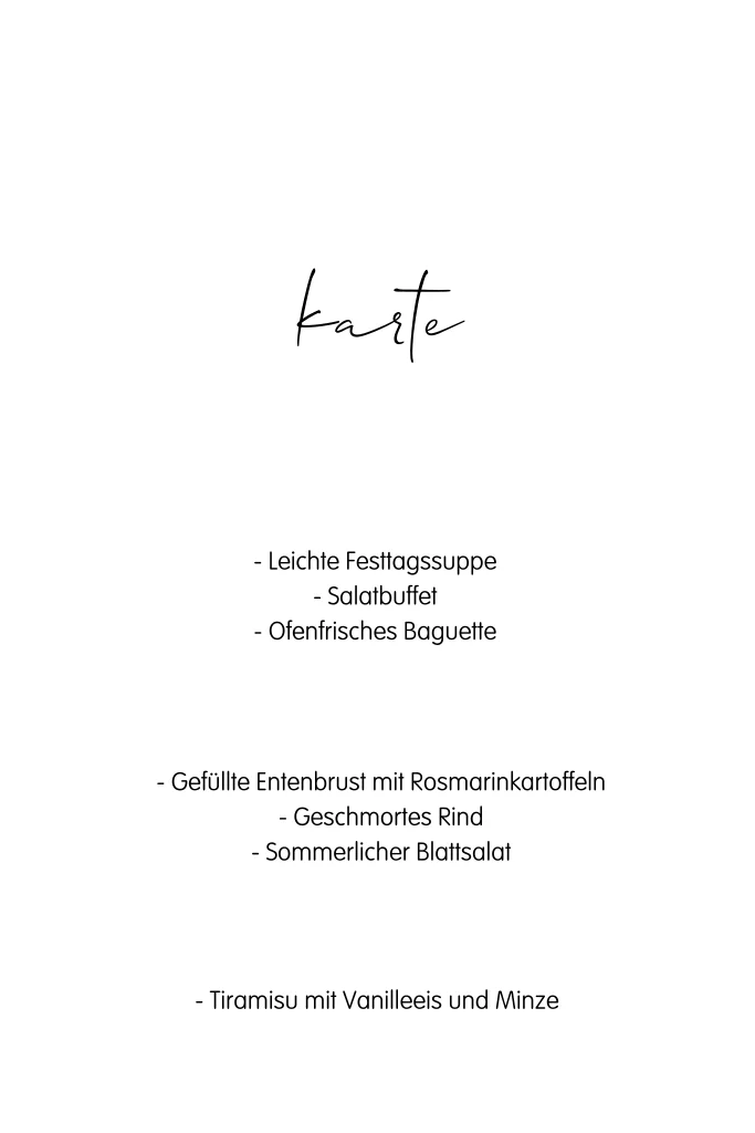 Das Menüheft bzw. die Menükarte auf dem feierlich gedeckten Tisch lässt Deine Gäste von Herzen zugreifen. Neben den Tischkarten sind die Menühefte der wichtigste Teil der Hochzeitspapeterie für die Feierlichkeiten nach der Trauung. Diese Menükarte ist überwiegend in Weiß gehalten und wirkt daher sehr schlicht. Die glänzenden Akzente runden die Karte ab.Hast du schon die dazu passende Save the Date Karte, Hochzeitskarte und Dankeskarte gesehen?
