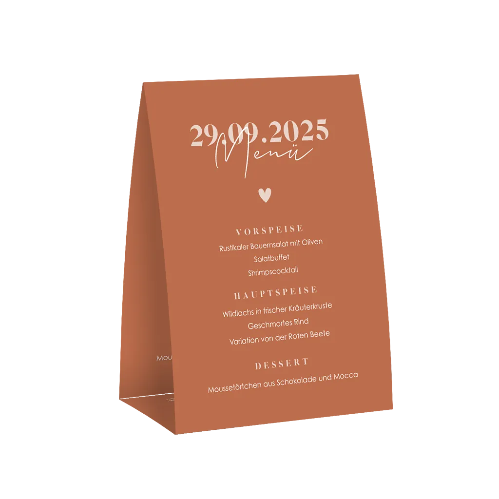 Stilvolle Aufsteller - Menükarte zur Hochzeit mit Datum und Herzen