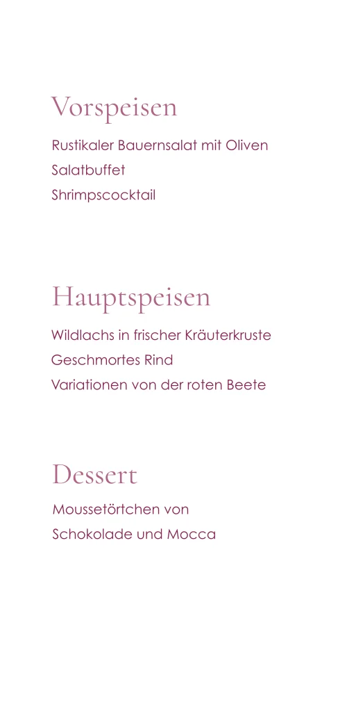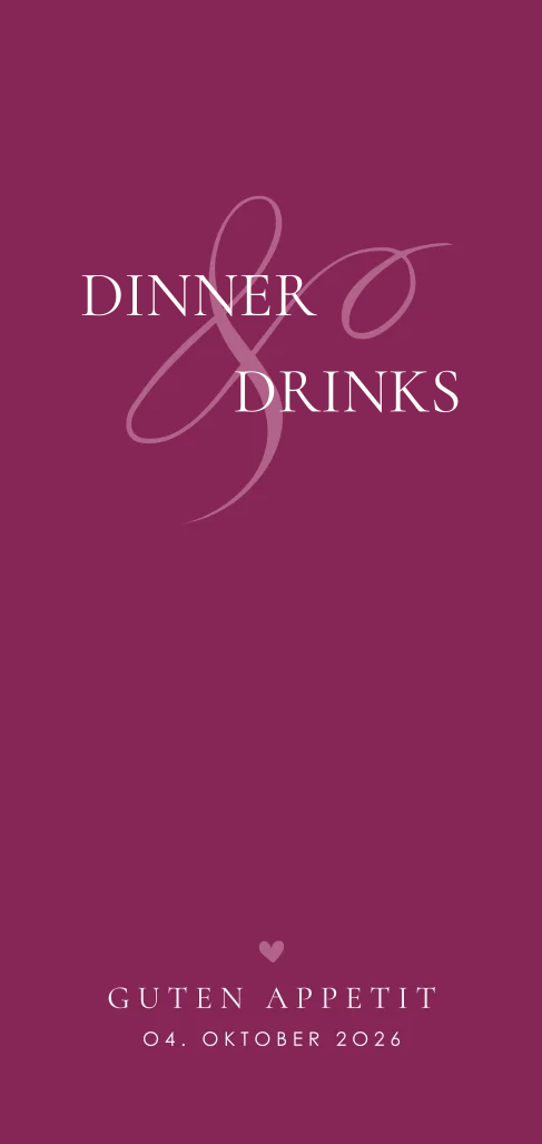Stilvolle Menükarte im Berry-Farbton.Melde dich für unseren Newsletter an und profitiere von exklusiven Angeboten, kreativen Ideen und Neuigkeiten aus unserer Produktwelt. Als Dankeschön für deine Anmeldung schenken wir dir einen kostenlosen Probedruck deiner Karte.