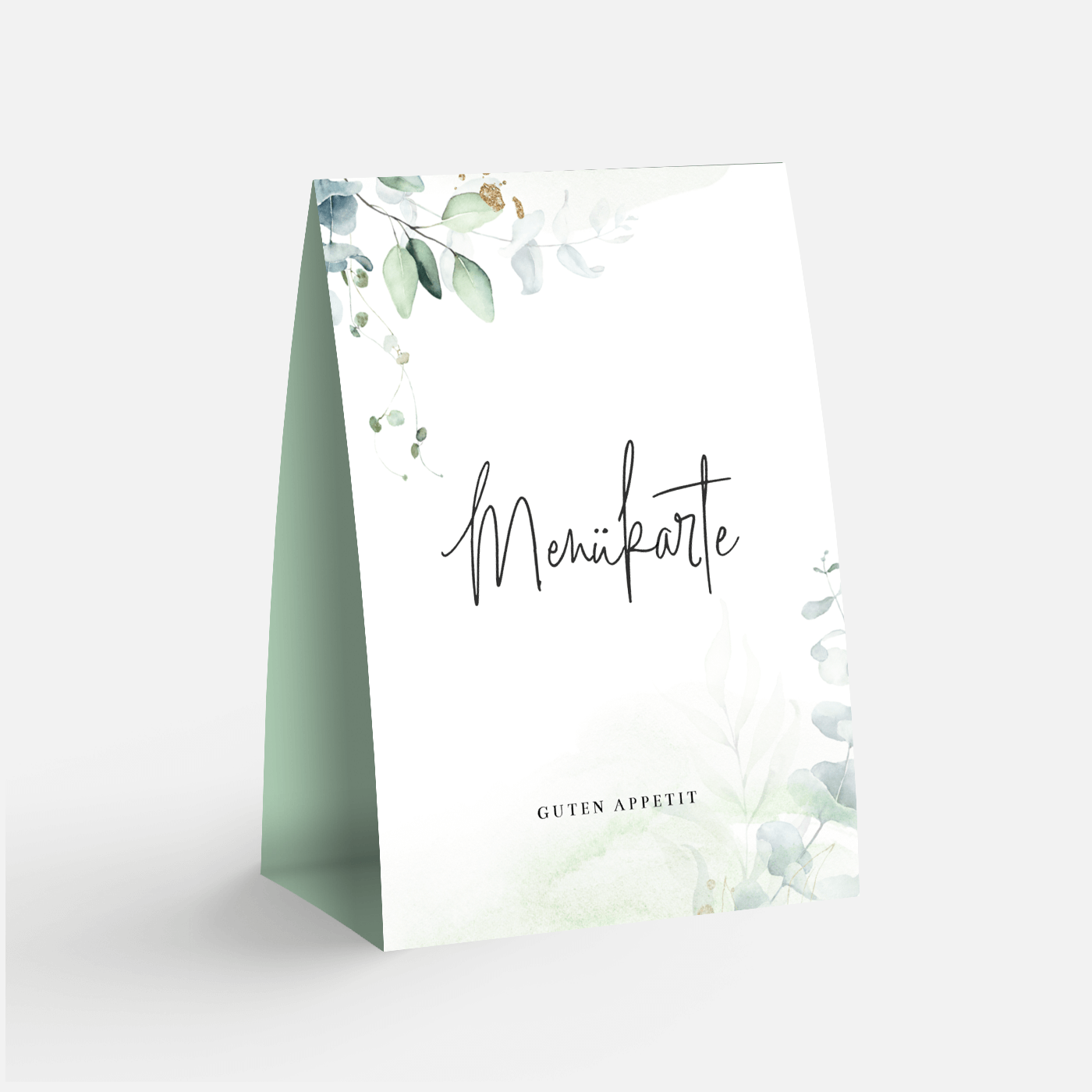 Stilvolle Speisekarte - Aufsteller mit Eukalyptusblättern in Aquarell
