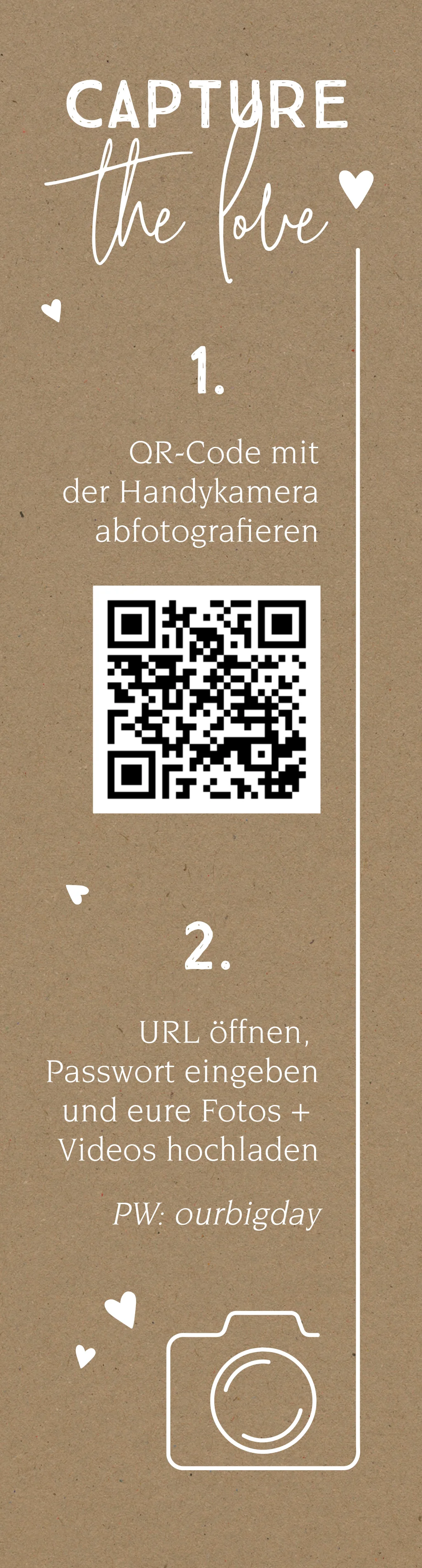 Fotostreifenkarte mit QR-Code im Kraftpapier-Look, im Set von 4 Stück mit Kamera und Herzchen Dieses 4er-Set besteht aus vier Karten, die du selbst bearbeiten kannst. Wenn du also zum Beispiel fünf 4er-Sets bestellst, erhältst du 20 Karten.