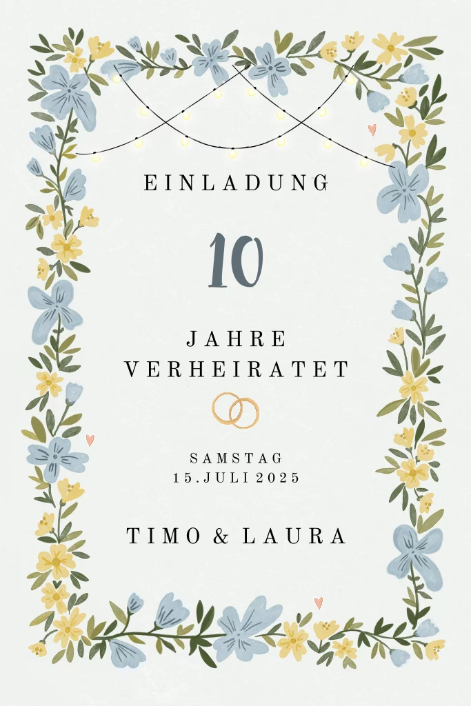 Florale Einladungskarte zur Rosenhochzeit mit Blumenrahmen und Lichterkette