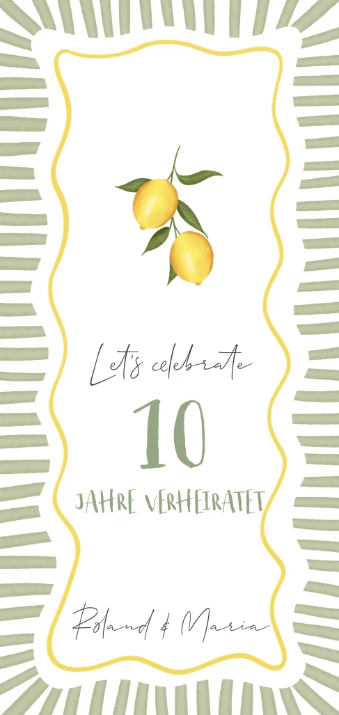 Einladungskarte zur Rosenhochzeit mit buntem Rahmen und Zitronen