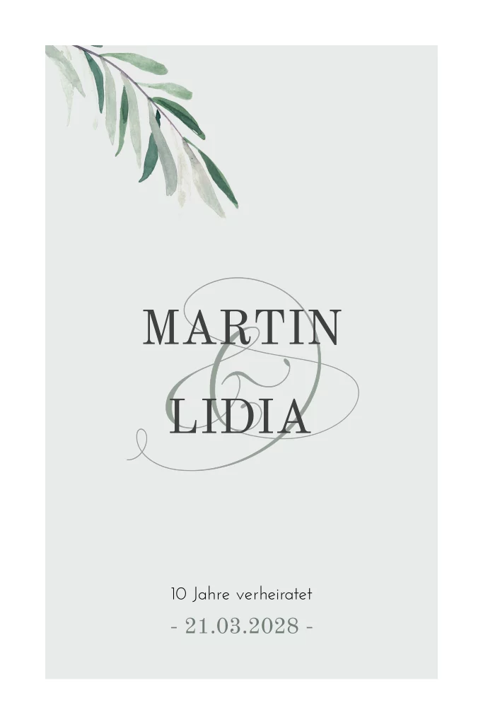 Rosenhochzeitseinladung mit grauen Blättern und klarer Schrift