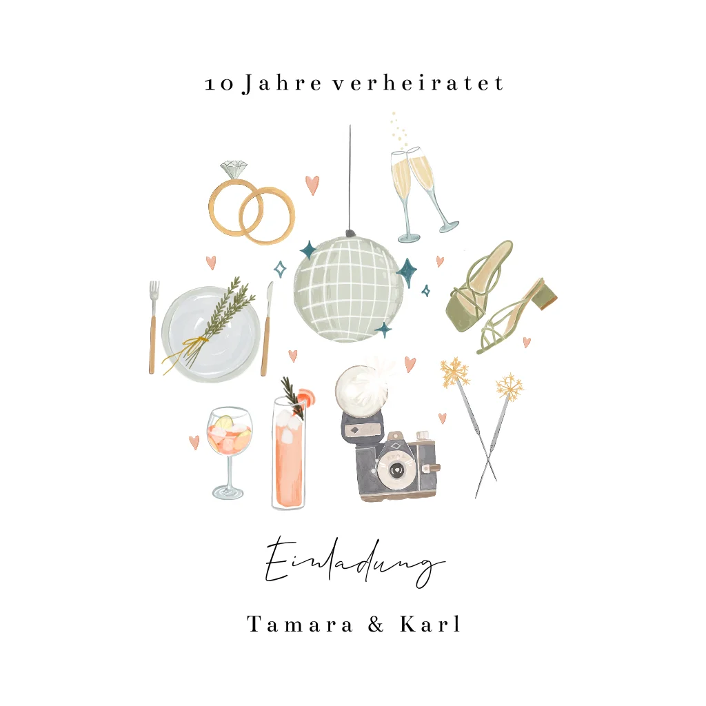 Verspielte Einladung zur Rosenhochzeit im Wasserfarben-Stil mit Getränken, Discokugel und Kamera