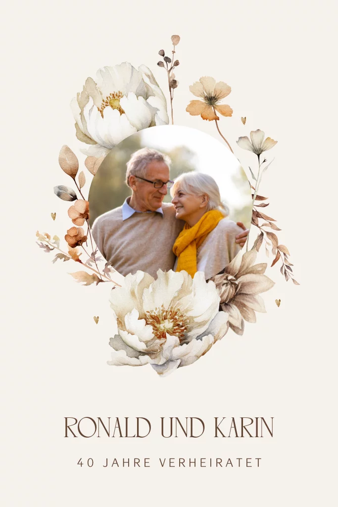 Florale Einladung zur Rubinhochzeit mit großen Blüten und eigenem Foto