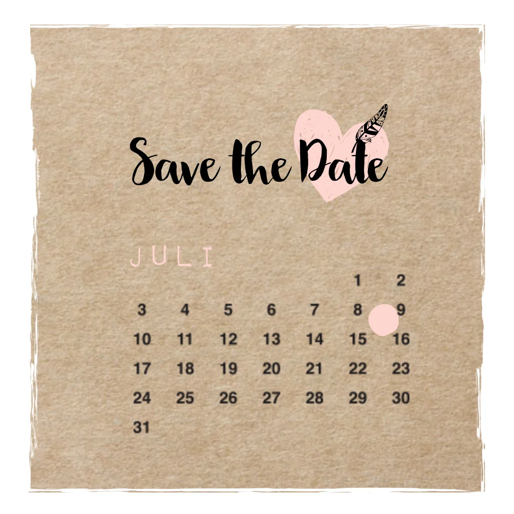 Wann heiraten Sie? Tragen Sie es in diesen Kalender ein! Diese angesagte Save the Date Karte hat einen Kraftpapier hintergrund und einen coolen Rand, den Sie umfärben können, wenn Sie wünschen. Mit dem hellrosa Herzen ist die Karte besonders schick!