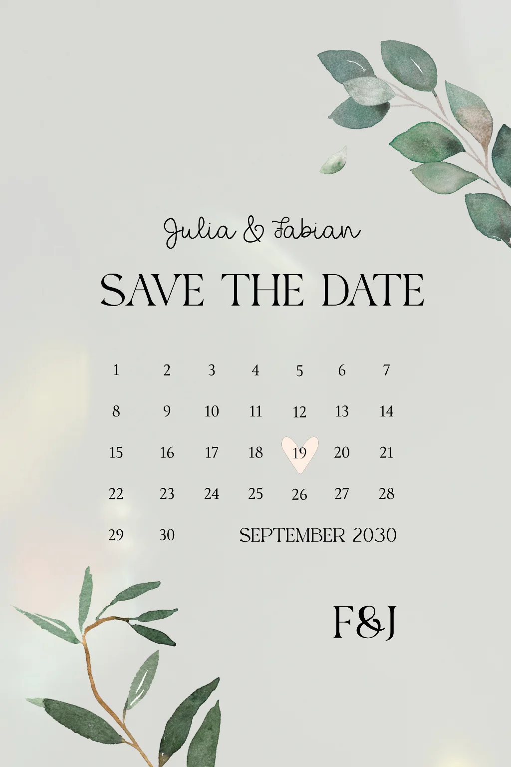 Botanische Save the Date Karte aus Acryl mit Kalender.