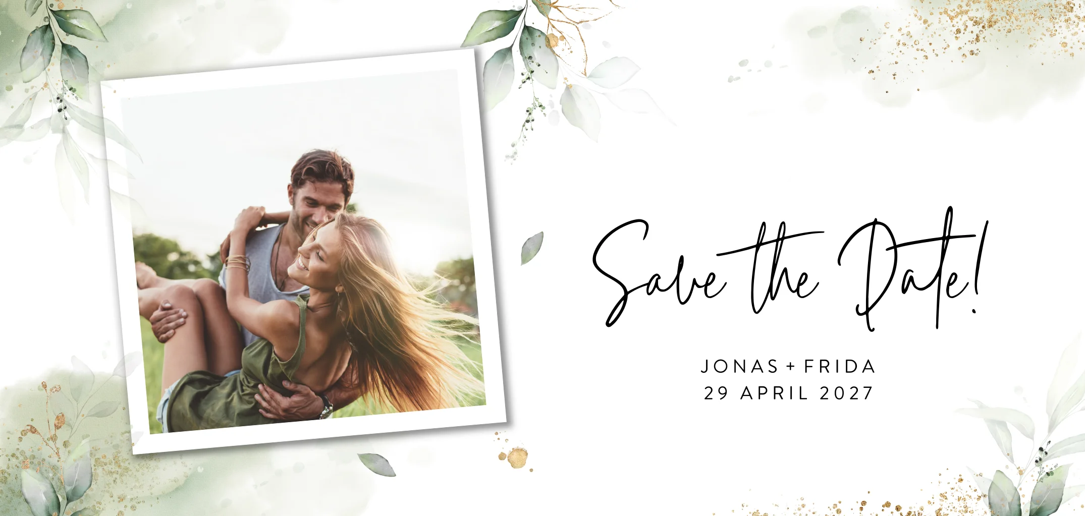 Sucht Ihr eine schöne Save-the-Date-Karte? Wie wäre es mit diesem stylischen Design? Die Karte hat hellgrüne Blätter und goldene Spritzer. Mit einer angesagten Schriftart befindet sich ein großes „Save the Date“ auf der Karte. Auf der Rückseite könnt Ihr den Eingeladenen alle notwendigen Informationen vermitteln.Melde dich für unseren Newsletter an und profitiere von exklusiven Angeboten, kreativen Ideen und Neuigkeiten aus unserer Produktwelt. Als Dankeschön für deine Anmeldung schenken wir dir einen kostenlosen Probedruck deiner Karte.