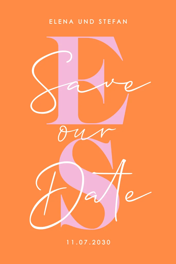 Colourblocking Save the Date-Karte mit Orange und Lila