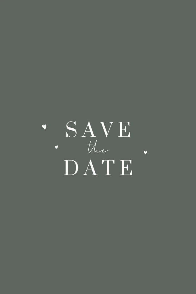 Elegante Save the date-Karte in Graugrün mit goldenen Herzchen