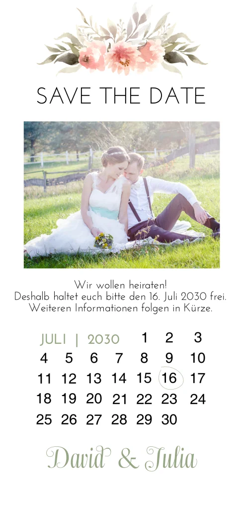 Eine stilvolle Save the Date-Karte mit romantischen Blumen, einem persönlichen Foto und einem Kalender, auf dem Sie Ihr Hochzeitsdatum einkreisen können. Jeder sollte diesen Termin frei halten!Melde dich für unseren Newsletter an und entdecke exklusive Angebote, kreative Inspirationen und spannende Neuigkeiten aus unserer Produktwelt. Als Dankeschön erhältst du 5 € Rabatt auf deine nächste Bestellung.