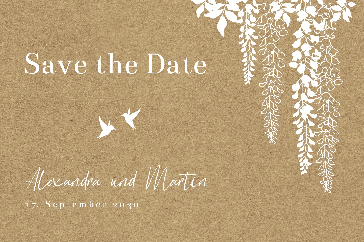 Kraft-Look Save-the-date Karte mit Goldfolie, Zweigen und Vögeln