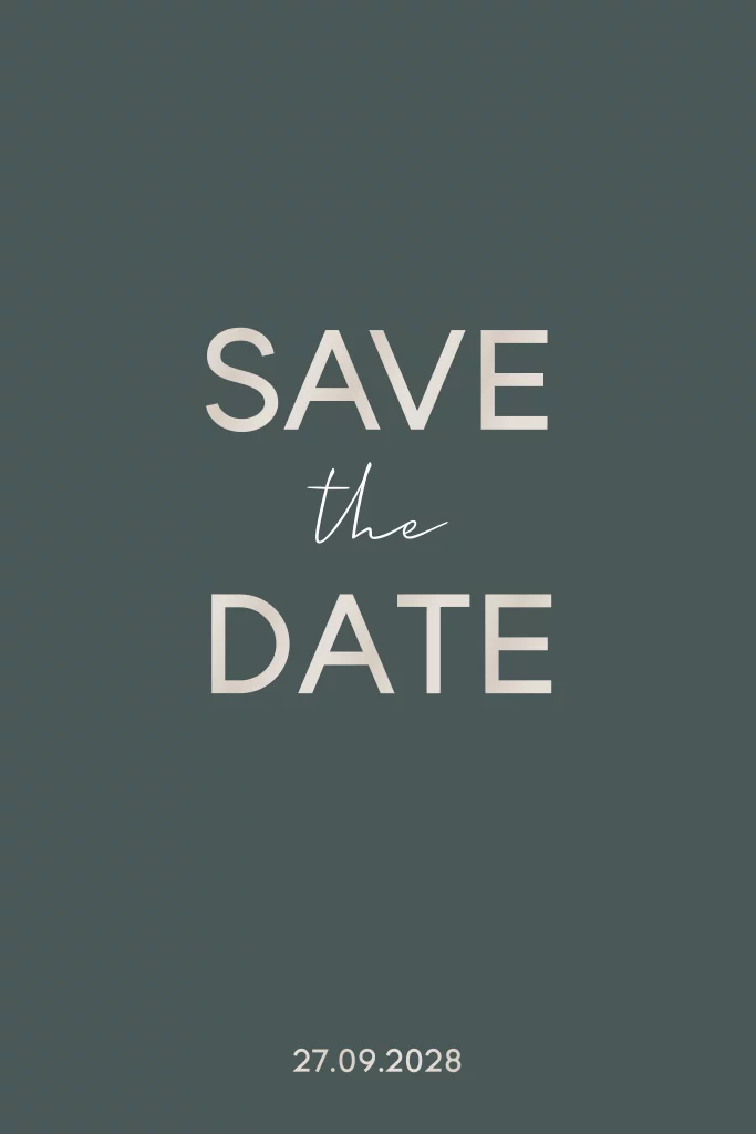 Moderne Save-the-Date Karte für Hochzeit mit dunkelgrünem HintergrundDas Design der von dir gewählten Karte wurde automatisch in andere Formate umgestellt. Wähle einfach deinen Wunschformat aus und platziere alle Texte und Elemente an der richtigen Stelle im Editor. Du hast Fragen oder dein Favorit steht nicht zur Auswahl? Dann kontaktiere uns bitte und wir werden uns gemeinsam darum kümmern!
