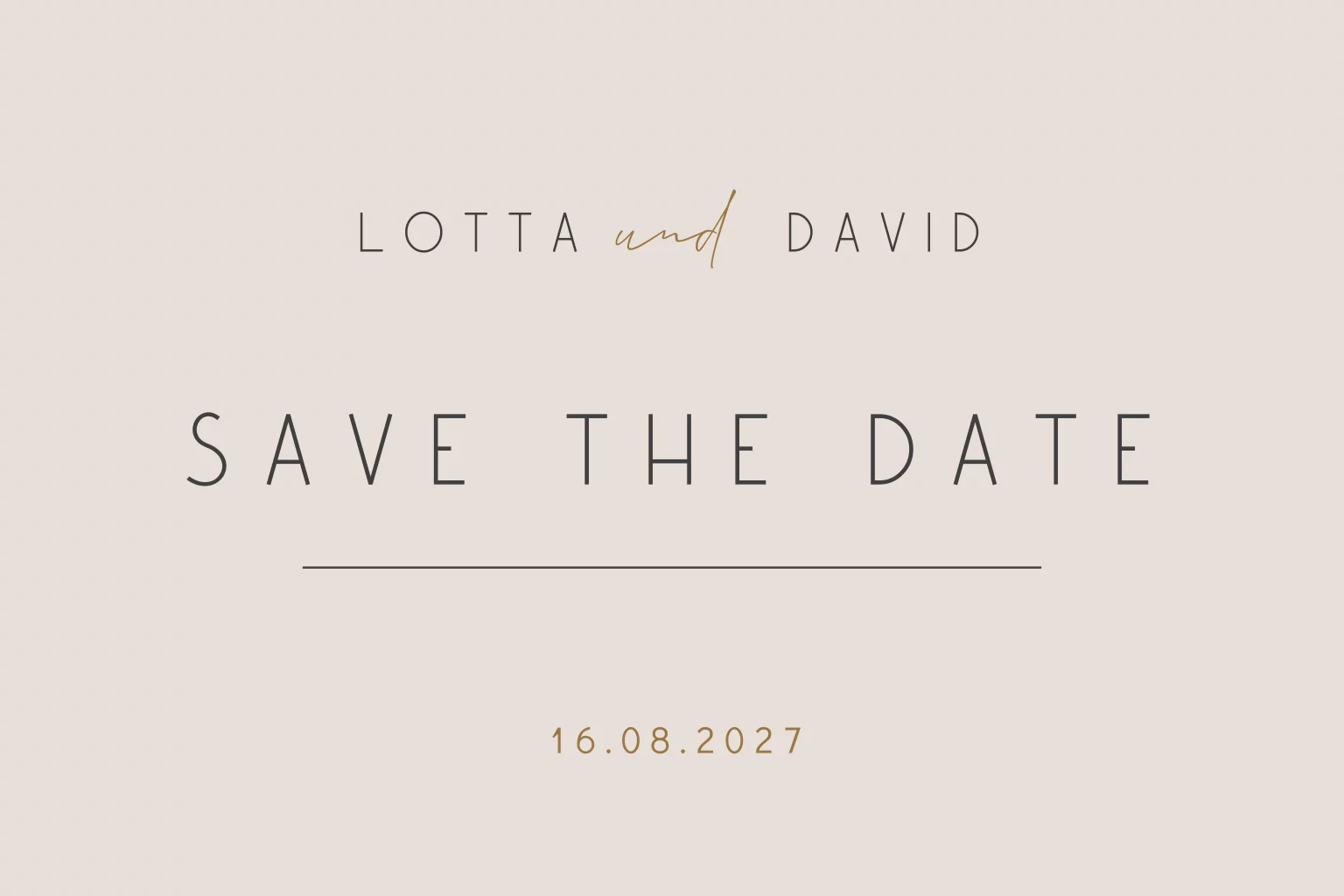 Der Termin für eure Hochzeit steht? Herzlichen Glückwunsch! Damit auch alle eure lieben Freunde und Verwandten an eurem großen Tag teilhaben können, solltet ihr so früh wie möglich Save-the-Date Karten versenden. Das kann ruhig ein Jahr oder noch länger vor der Hochzeit sein!Das Design der von dir gewählten Karte wurde automatisch in andere Formate umgestellt. Wähle einfach deinen Wunschformat aus und platziere alle Texte und Elemente an der richtigen Stelle im Editor. Du hast Fragen oder dein Favorit steht nicht zur Auswahl? Dann kontaktiere uns bitte und wir werden uns gemeinsam darum kümmern!