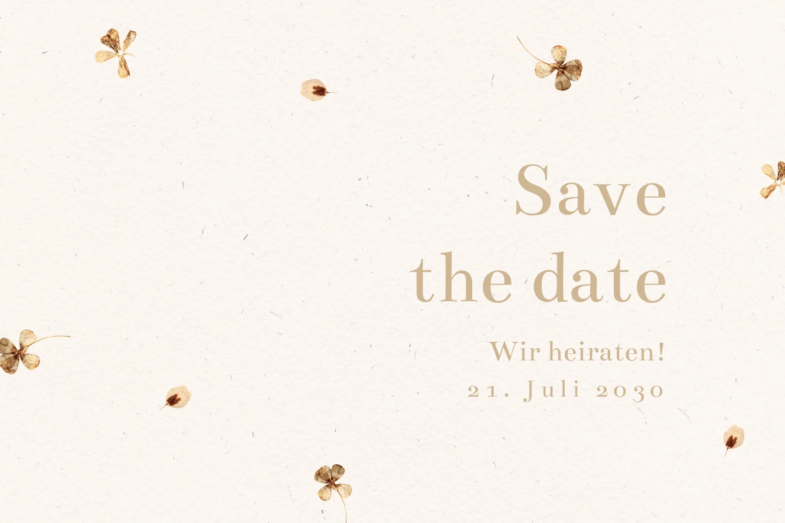 Retro Save the Date Karte mit gepressten Blüten.Melde dich für unseren Newsletter an und profitiere von exklusiven Angeboten, kreativen Ideen und Neuigkeiten aus unserer Produktwelt. Als Dankeschön für deine Anmeldung schenken wir dir einen kostenlosen Probedruck deiner Karte.