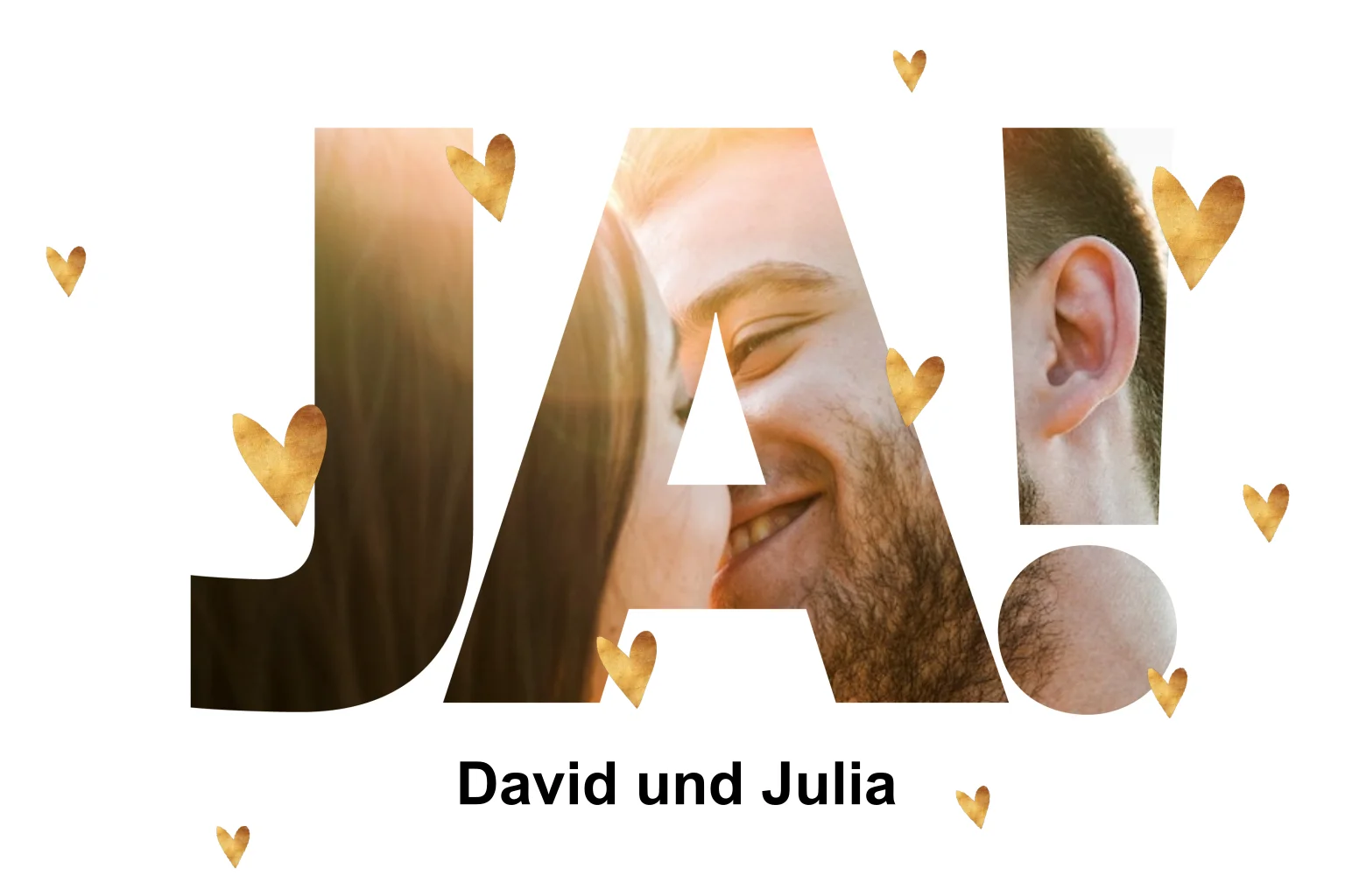 Viele goldene Herzen auf der Hochzeitskarte, wie romantisch! Lädst du Ihre Freunde und Familie zu Ihrem Hochzeitstag mit dieser modischen Karte ein! Das Schöne an dieser Karte ist, dass du ein persönliches Foto hinzufügen können, das du hinter den Buchstaben "JA" sehen. Wann sagst du JA?