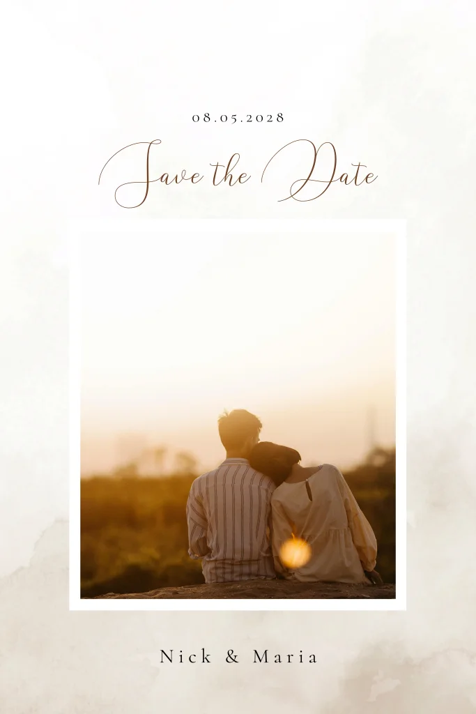Wunderschöne Save-the- Date Karte mit geschwungener Schrift und FotoDas Design der von dir gewählten Karte wurde automatisch in andere Formate umgestellt. Wähle einfach deinen Wunschformat aus und platziere alle Texte und Elemente an der richtigen Stelle im Editor. Du hast Fragen oder dein Favorit steht nicht zur Auswahl? Dann kontaktiere uns bitte und wir werden uns gemeinsam darum kümmern!