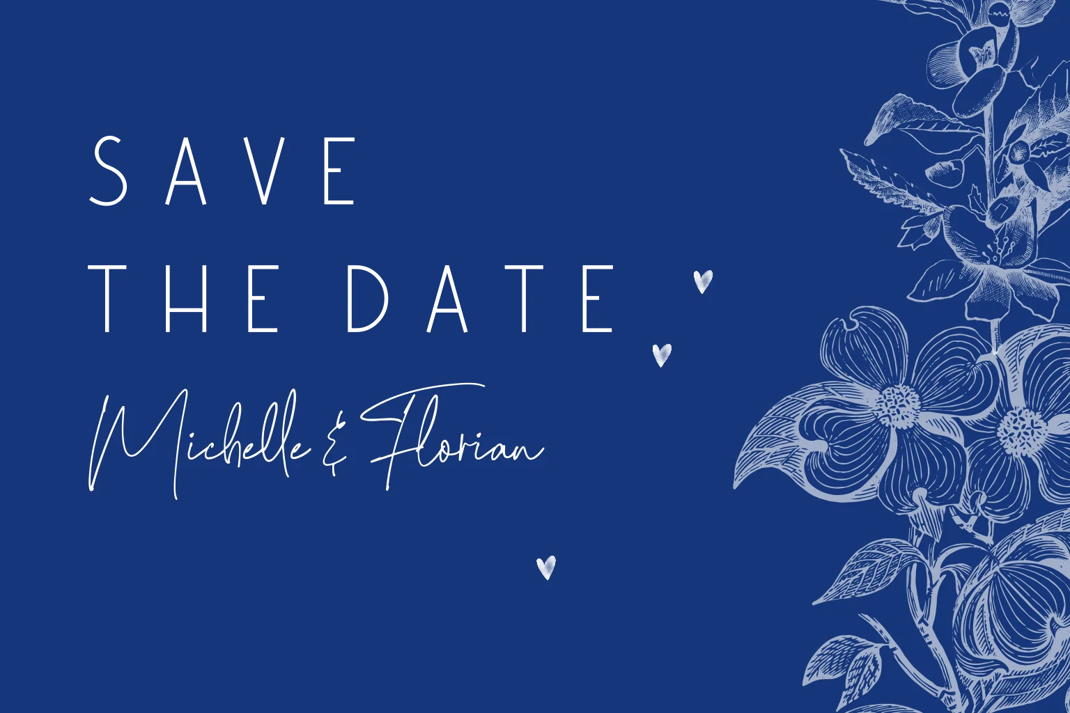 Save the Date Karte mit blauen Blumen und Silberfolie