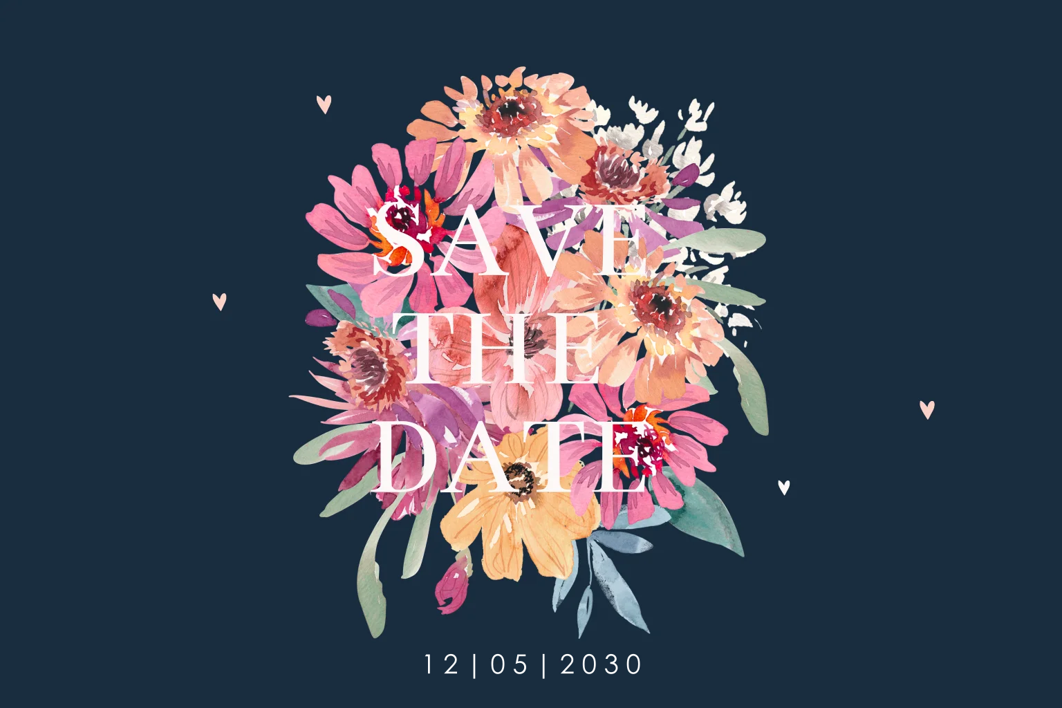 Save the date Karte mit bunten Blumen auf dunkelblau