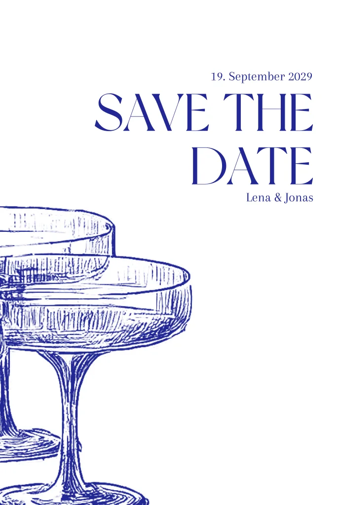 Eine schöne Save the Date-Karte mit handgezeichneten blauen Champagnergläsern für ein schickes Aussehen.Melde dich für unseren Newsletter an und profitiere von exklusiven Angeboten, kreativen Ideen und Neuigkeiten aus unserer Produktwelt. Als Dankeschön für deine Anmeldung schenken wir dir einen kostenlosen Probedruck deiner Karte.
