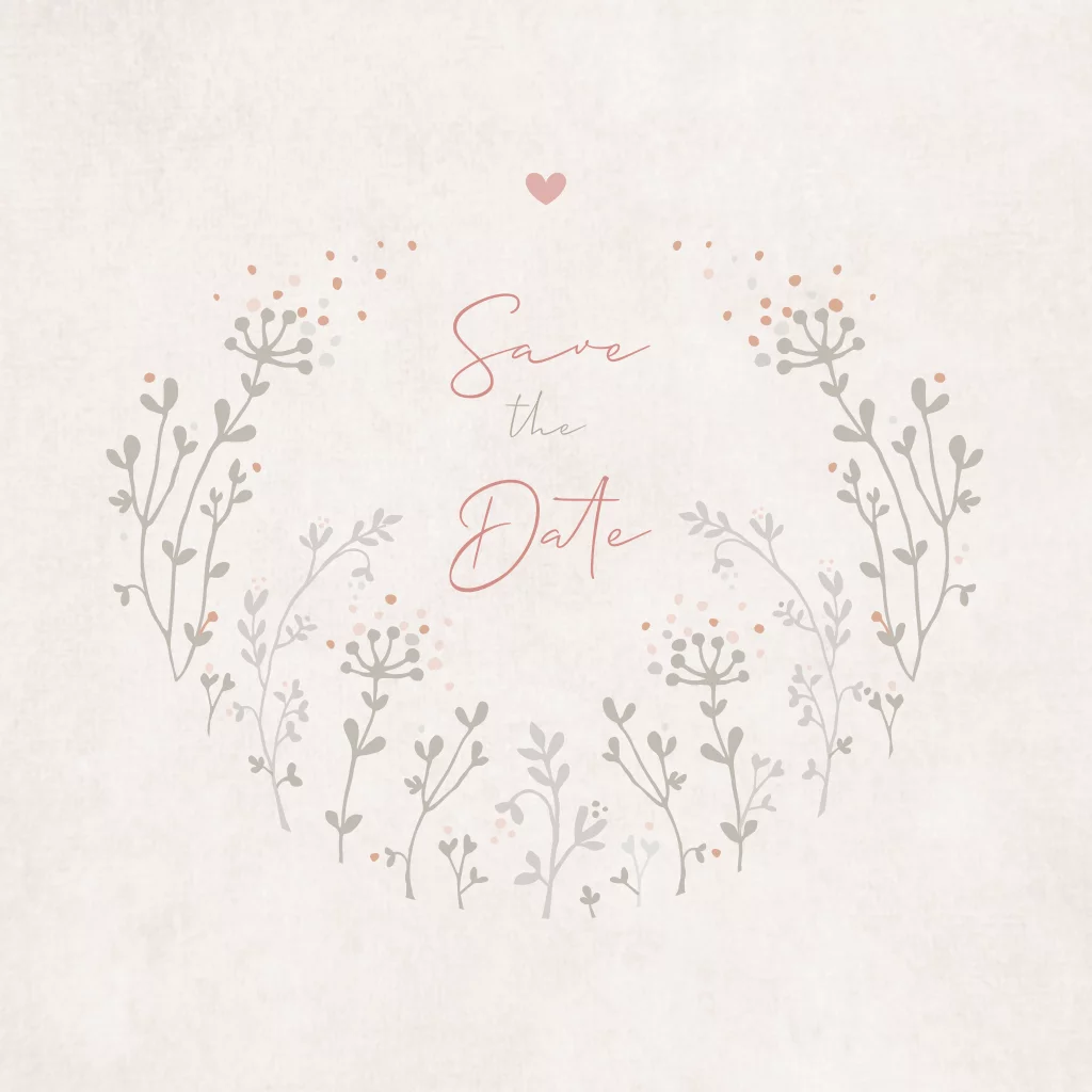 Schöne botanische Save the date-Karte mit grafischen Blumen und Samt-Look Hintergrund. Ihr könnt diese Karte leicht selbst bearbeiten.Hast du schon die dazu passende Hochzeitskarte, Menükarte und Dankeskarte gesehen?