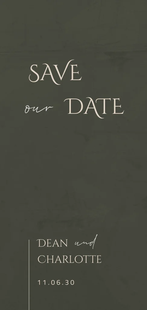Save the date-Karte Green VelvetDas Design der von dir gewählten Karte wurde automatisch in andere Formate umgestellt. Wähle einfach deinen Wunschformat aus und platziere alle Texte und Elemente an der richtigen Stelle im Editor. Du hast Fragen oder dein Favorit steht nicht zur Auswahl? Dann kontaktiere uns bitte und wir werden uns gemeinsam darum kümmern!