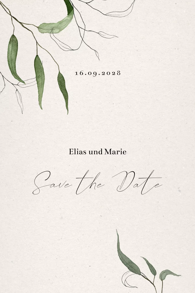 Elegante Save-the-date-Karte mit grünen Blättern auf einem dezenten HintergrundDas Design der von dir gewählten Karte wurde automatisch in andere Formate umgestellt. Wähle einfach deinen Wunschformat aus und platziere alle Texte und Elemente an der richtigen Stelle im Editor. Du hast Fragen oder dein Favorit steht nicht zur Auswahl? Dann kontaktiere uns bitte und wir werden uns gemeinsam darum kümmern!