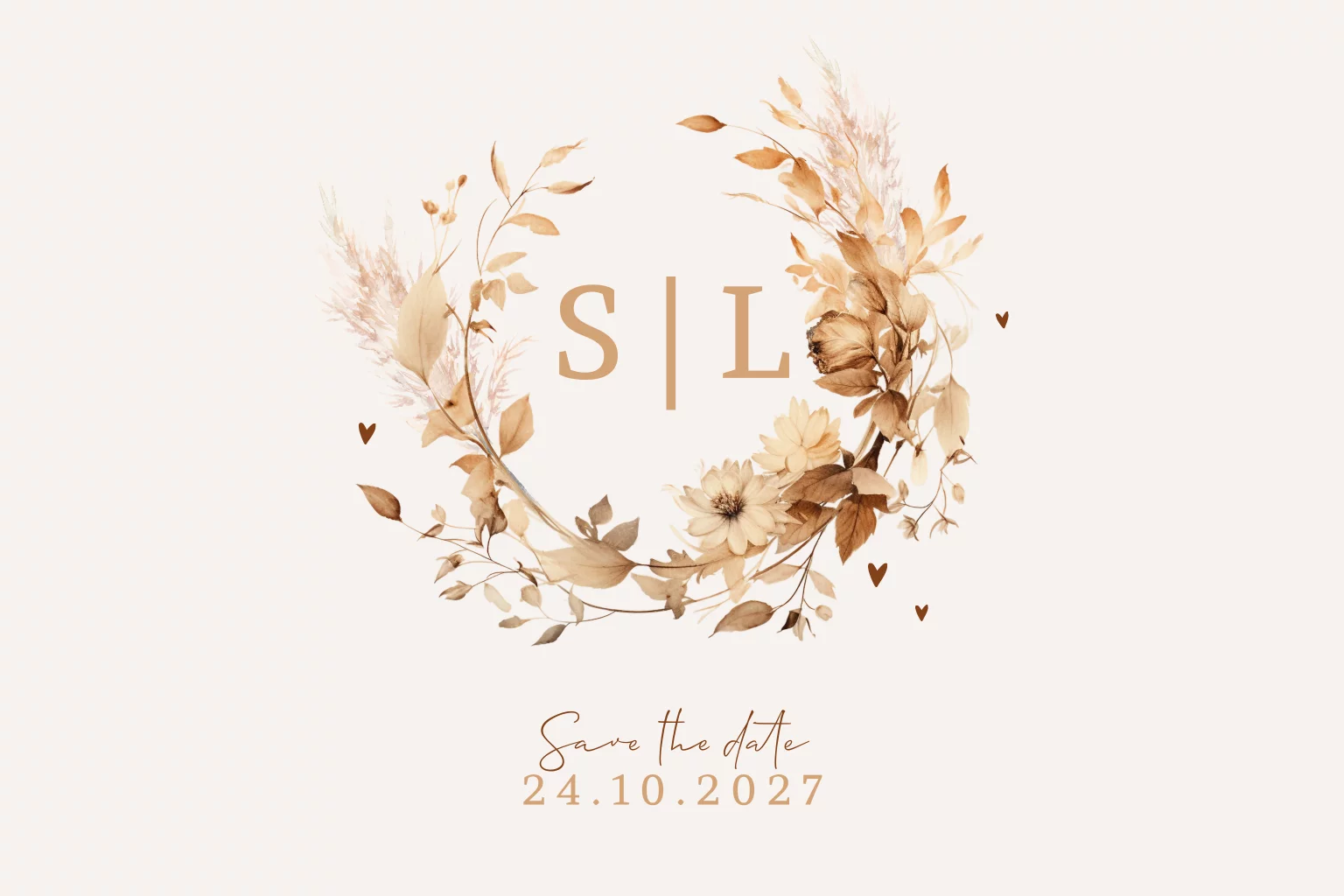 Save the Date Karte mit Blumenkranz und Initialen des Brautpaars