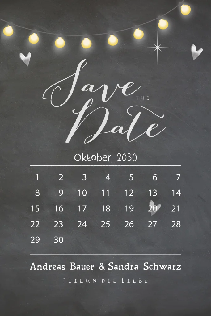 Save the Date Karte mit Herzen, Kalender und Lampengirlanden.Melde dich für unseren Newsletter an und profitiere von exklusiven Angeboten, kreativen Ideen und Neuigkeiten aus unserer Produktwelt. Als Dankeschön für deine Anmeldung schenken wir dir einen kostenlosen Probedruck deiner Karte.