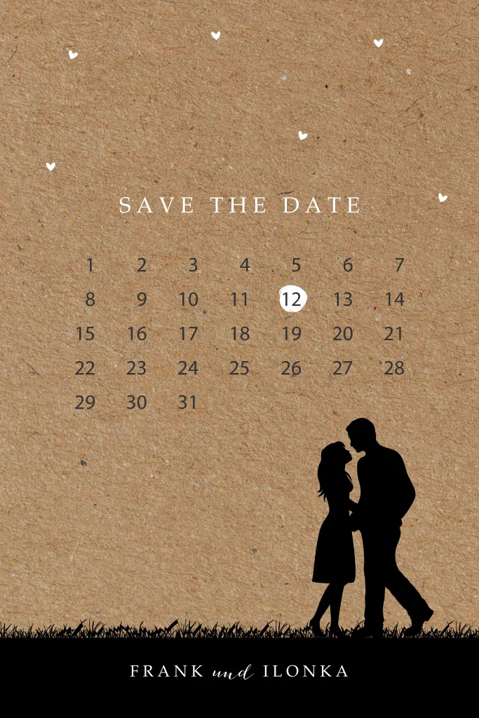 Wenn es Zeit ist, euren ganz besonderen Tag anzukündigen, könnt ihr eure Gäste mit dem natürlichen Design dieser Kraftpapierkarte mit Kalender und süßer Silhouette unter'm Sternenhimmel überraschen.Melde dich für unseren Newsletter an und profitiere von exklusiven Angeboten, kreativen Ideen und Neuigkeiten aus unserer Produktwelt. Als Dankeschön für deine Anmeldung schenken wir dir einen kostenlosen Probedruck deiner Karte.