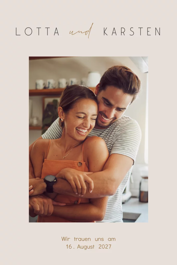 Save the Date Karte im Naturton mit Foto.Melde dich für unseren Newsletter an und profitiere von exklusiven Angeboten, kreativen Ideen und Neuigkeiten aus unserer Produktwelt. Als Dankeschön für deine Anmeldung schenken wir dir einen kostenlosen Probedruck deiner Karte.