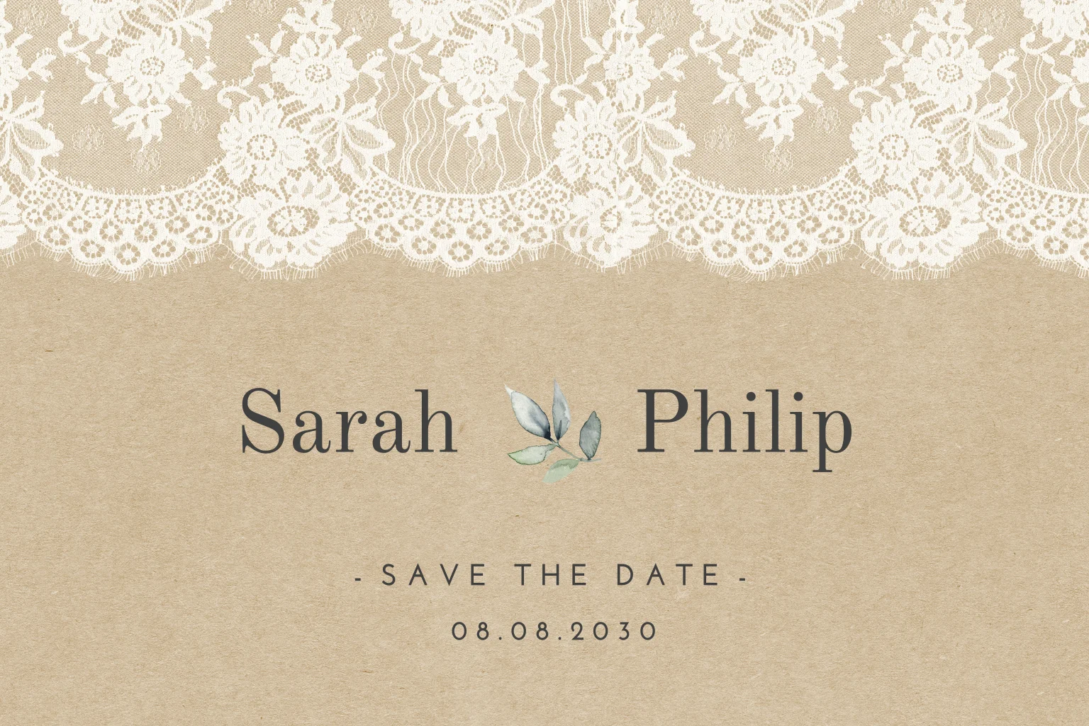 Diese stilvolle Save-the-Date-Karte ist mit der weißen Spitze auf dem Hintergrund im Kraft-Look etwas ganz besonderes. Zwischen den Namen ist ein grüner Zweig in Wasserfarbenoptik. Passt den Text einfach im Online-Editor an.