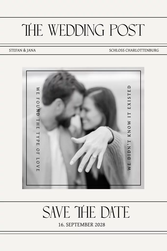 Was für eine perfekte Karte, um Ihre Hochzeit anzukündigen! Diese Karte hat mit dem Zeitungslook und der schönen Typografie einen Vintage-Look und ist dennoch modern.Das Design der von dir gewählten Karte wurde automatisch in andere Formate umgestellt. Wähle einfach deinen Wunschformat aus und platziere alle Texte und Elemente an der richtigen Stelle im Editor. Du hast Fragen oder dein Favorit steht nicht zur Auswahl? Dann kontaktiere uns bitte und wir werden uns gemeinsam darum kümmern!