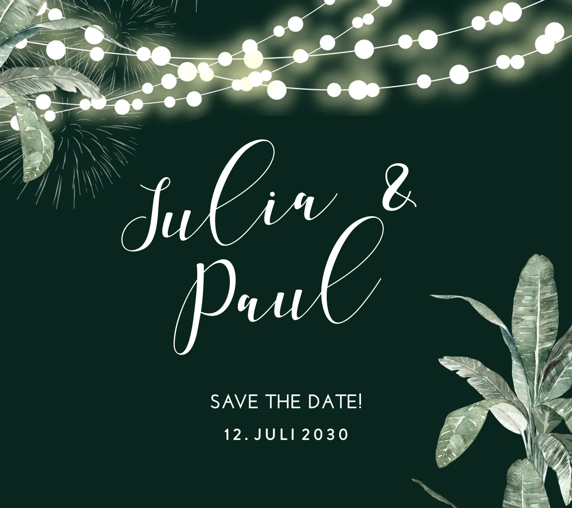 Save the Date Karte mit tropischen Palmen und Lichterketten auf dunklem HintergrundDas Design der von dir gewählten Karte wurde automatisch in andere Formate umgestellt. Wähle einfach deinen Wunschformat aus und platziere alle Texte und Elemente an der richtigen Stelle im Editor. Du hast Fragen oder dein Favorit steht nicht zur Auswahl? Dann kontaktiere uns bitte und wir werden uns gemeinsam darum kümmern!