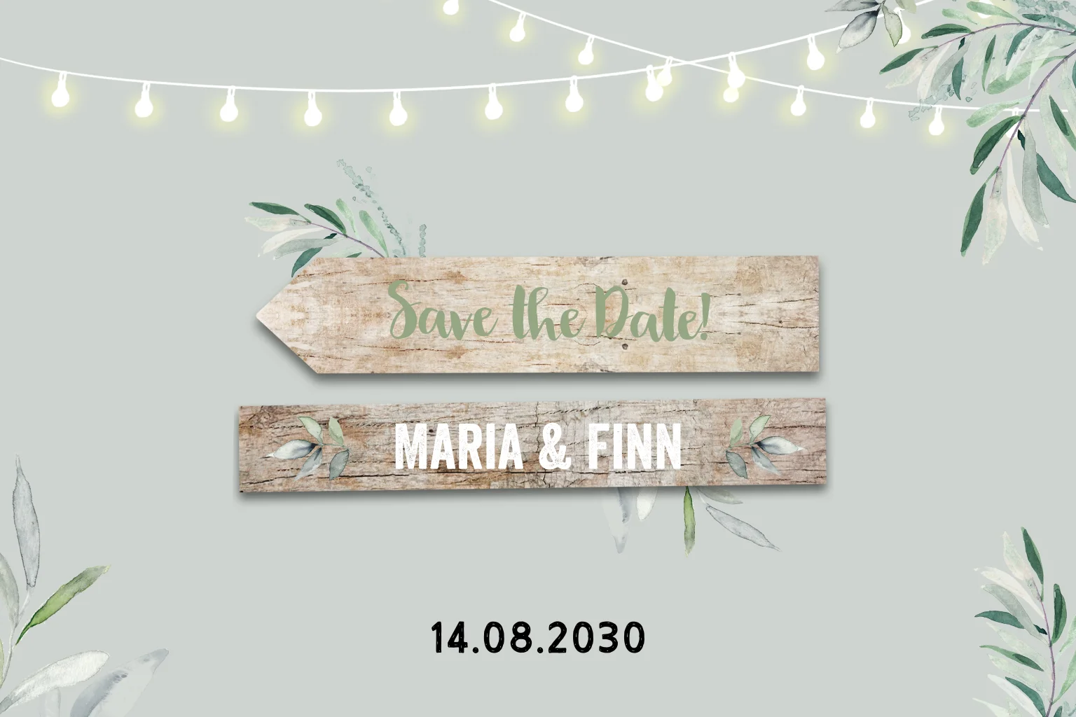 Save the Date Karte mit Wegweisern im sommerlichen Look mit Lichterketten und ZweigenMelde dich für unseren Newsletter an und profitiere von exklusiven Angeboten, kreativen Ideen und Neuigkeiten aus unserer Produktwelt. Als Dankeschön für deine Anmeldung schenken wir dir einen kostenlosen Probedruck deiner Karte.