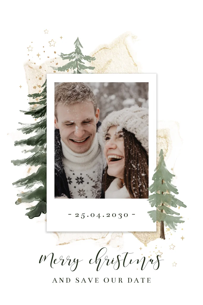 Save the Date Weihnachtskarte zur Hochzeit mit Tannen und Foto