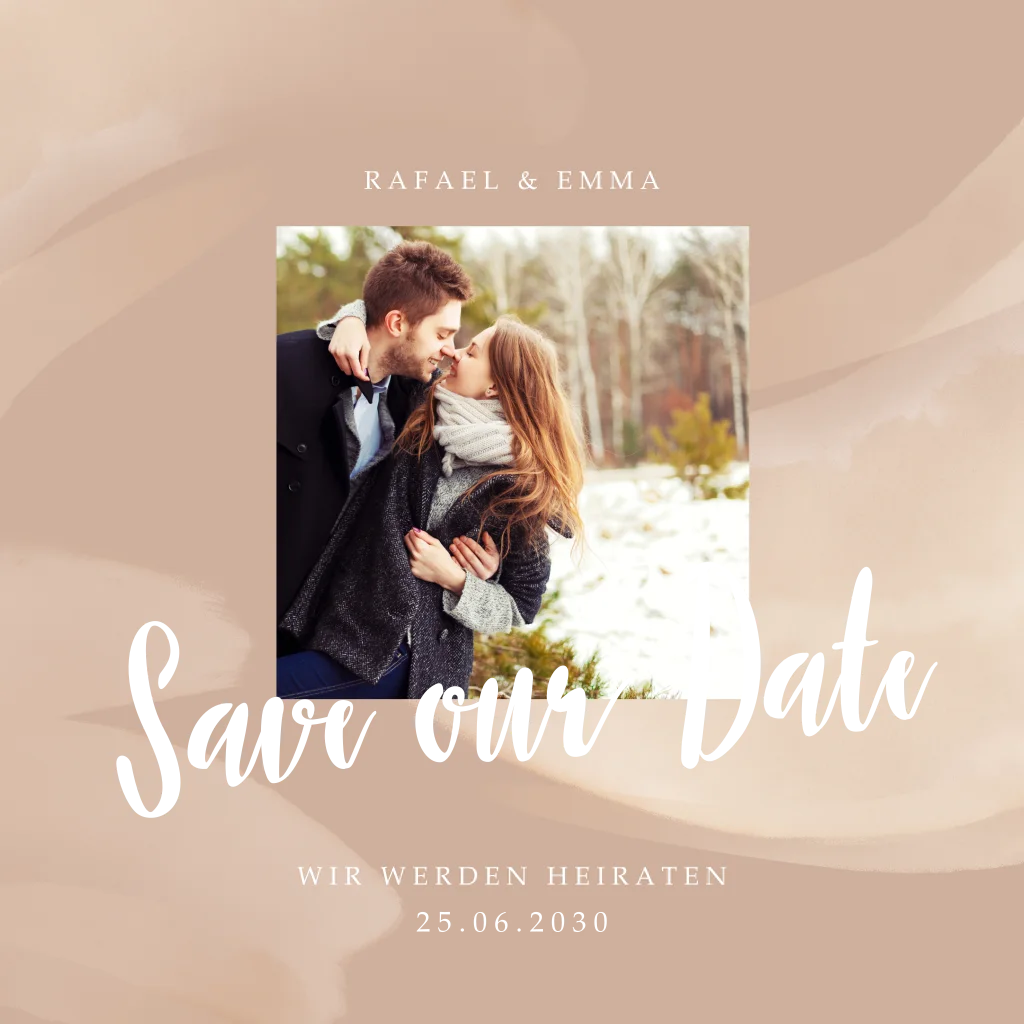 Save the Date: Ihr werdet heiraten! Mit dieser Save the Date-Karte kann sich jeder euer Hochzeitsdatum freihalten. Sie zeichnet sich durch klare und elegante Schriftarten und einen Aquarellhintergrund aus. Eine selbst gestaltete Save-the-Date Karte ist der vielleicht wichtigste Schritt nach dem Heiratsantrag. Sie stimmt Eure Gäste auf die Hochzeit ein und gibt einen Vorgeschmack auf Stil und Thema. In unserem Designmodul könnt ihr Text und Farben leicht anpassen.Hast du schon die dazu passende Hochzeitskarte, Menükarte und Dankeskarte gesehen?