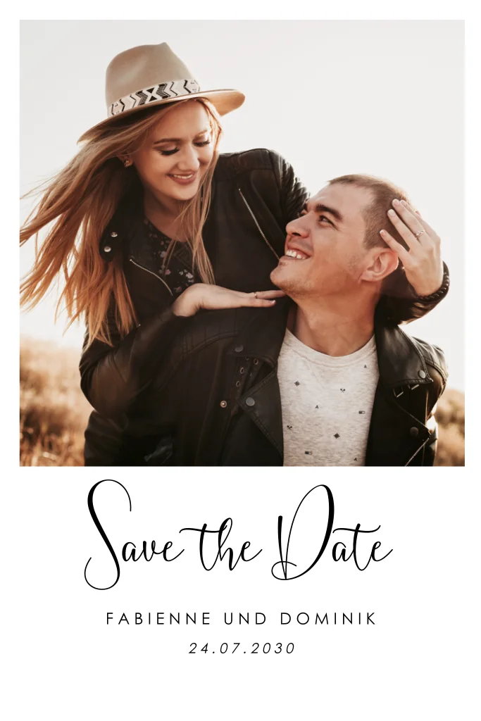 Der Termin für eure Hochzeit steht? Herzlichen Glückwunsch! Damit auch alle eure lieben Freunde und Verwandten an eurem großen Tag teilhaben können, solltet ihr so früh wie möglich Save-the-Date Karten versenden. Das kann ruhig ein Jahr oder noch länger vor der Hochzeit sein!Durch den Zuschnitt der Karten können 1-3mm Breitenunterschied (links/rechts und oben/unten) am Rahmen auftreten. Tipp: Gestalte den Rand so groß wie möglich, damit dieser mögliche Unterschied nicht auffällt.